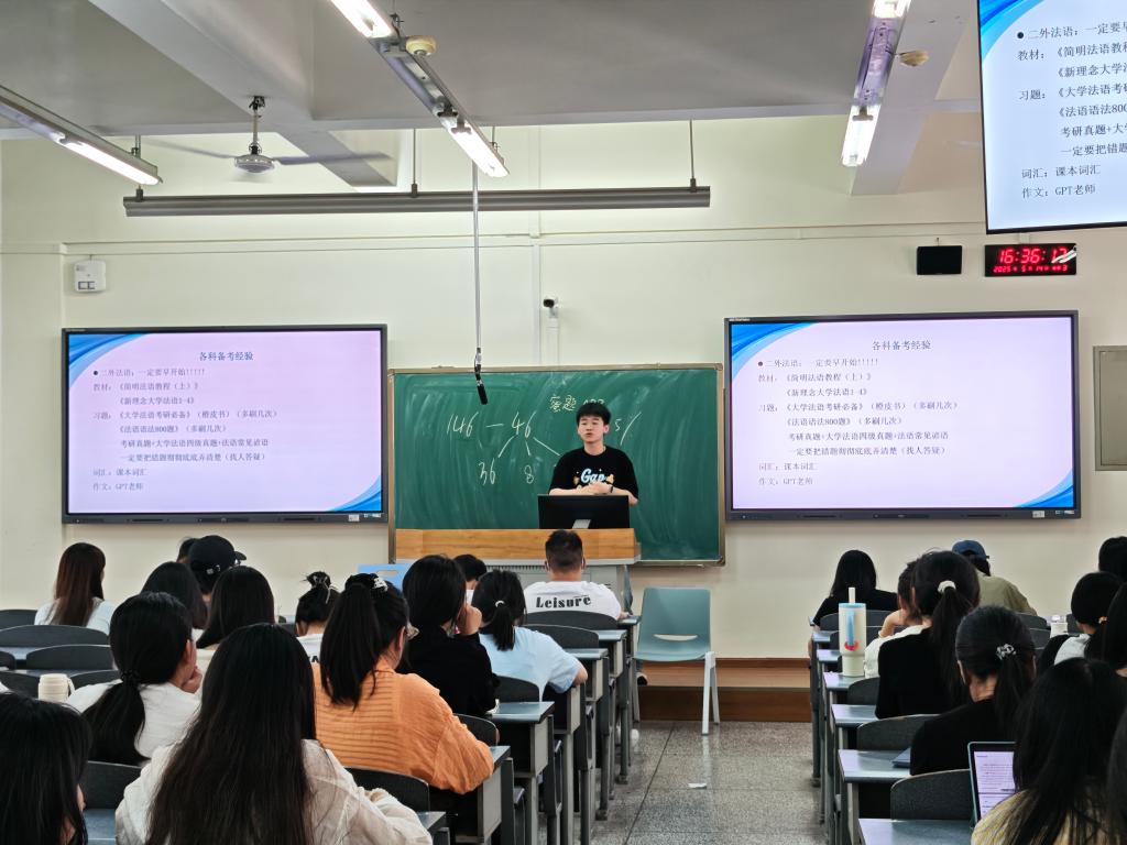 分享环节,同学们结合自身经历,从夏令营申请、复习规划、时间管理、院校选择、复试技巧等方面分享了个人经验。分享了他们在学校、专业、参考书选择等方面的经验和见解,共享了他们在考研各阶段学习的心得和体会,鼓励同学们要树立考研自信,多利用真题进行模拟训练,努力拼搏,为自己的人生添光增彩。
