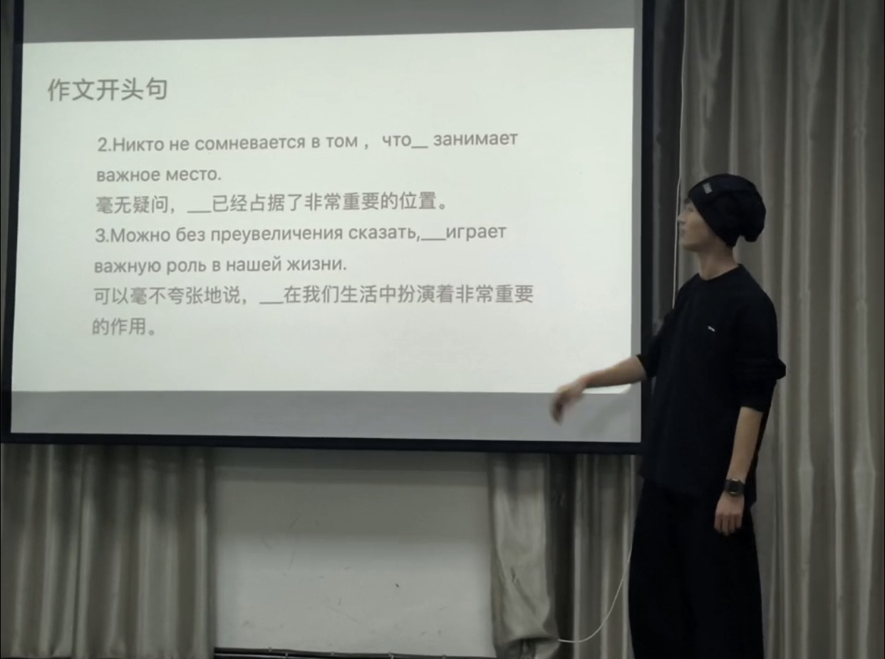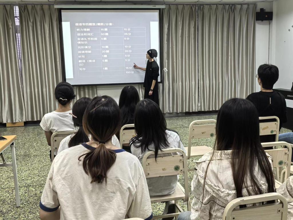 分享会上,吴家辉首先以表格形式拆解俄语专四考试题型结构,从听力、语法、阅读到写作四大板块逐一分析分值权重与命题特点。他特别指出:“专四考试强调基础扎实与应用灵活的结合,尤其是语法部分的系统性复习和作文的逻辑连贯性至关重要。”通过对比近年真题变化,他提醒学弟学妹关注新增题型趋势,避免陷入“经验主义”误区。