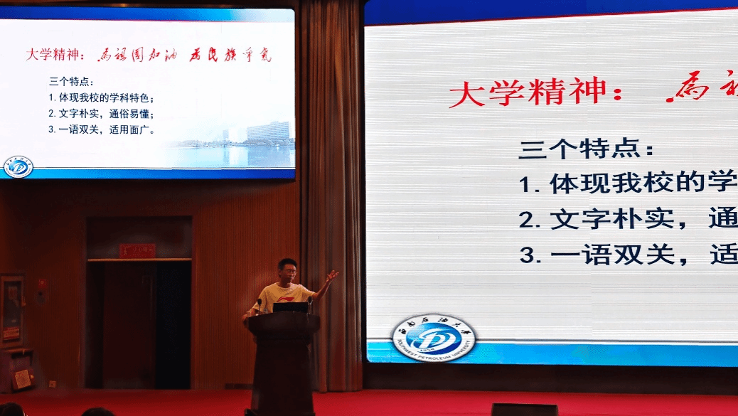 向老师以饱满的热情,引领新生们追溯了西南石油大学精神的源头。他通过详实的史料和生动的案例,从精神由来、形成过程及深远影响三个维度,将我校石油先辈们在艰难困苦中砥砺前行的故事娓娓道来。开篇,他详细介绍了学校曲折而光辉的发展历程。学校成立于1958年,原名四川石油学院,是新中国创建的第二所石油本科院校。1970年更名为西南石油学院,2005年12月正式更名为西南石油大学。他特别讲述了初创时期的艰苦岁月:1958年,学校先在成都招收643名首届学生,随后奔赴南充筹建学院。师生们一边建校,一边学习,晴天出工,雨天上课,白天劳动,晚上学习,这种艰苦环境锻造了西南石大人坚韧不拔的品质。接着,向老师讲述了以罗平亚院士为代表的西南石大人的感人事迹。这位1963届毕业生、油田化学专家,1995年当选中国工程院院士。1973年,他参与中国第一口超深井“女基井”的泥浆攻关任务,经过800多个日夜的艰苦努力,终于攻克了技术难题。他还分享了经济管理学院学生刘宸的励志故事:刘宸参军后,通过不懈努力,在国际军事比赛中获得3枚金牌,被记一等功……同时,他还自豪地介绍了学校取得的辉煌成就。经过60多年建设,学校已成为以工为主、多学科协调发展的高校。石油与天然气工程一级学科在全国第四轮学科评估中获评A+,排名全国第一。2017年,学校入选国家首批“双一流”世界一流学科建设高校。