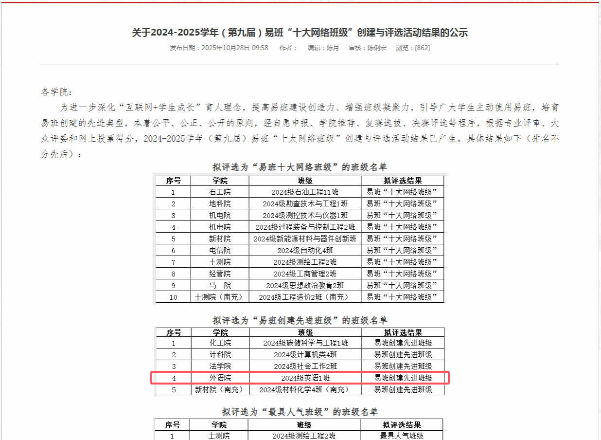 10月28日,学校发布《关于2024-2025学年(第九届)易班“十大网络班级”创建与评选活动结果的公示》,2024级英语一班成功斩获“易班创建先进班级”荣誉称号。