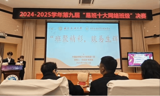决赛现场氛围热烈,各参赛班级围绕易班建设成果、班级文化打造、线上线下活动开展等方面展开精彩答辩。其中,我院2024级英语一班的答辩人何成涛、饶浠淼,以“班聚精彩,燚易生辉”为主题,从班级易班平台运营、特色活动设计、班级凝聚力提升等维度,全方位展示了班级在易班建设中的创新实践与显著成效,其精彩表现赢得了评委与现场观众的一致认可。