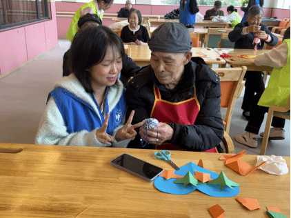 本次活动的亮点之一是传统文化体验环节。志愿者们手把手带领老人编织中国结、学习剪纸,指尖流转的不仅是传统技艺的魅力,更是两代人之间的情感交流。活动过程中,志愿者们还为老人送上亲手准备的围巾、香包等小礼物,细微之处尽显关怀与心意。