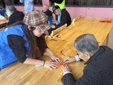 图三:志愿者和老人共同制作同心结