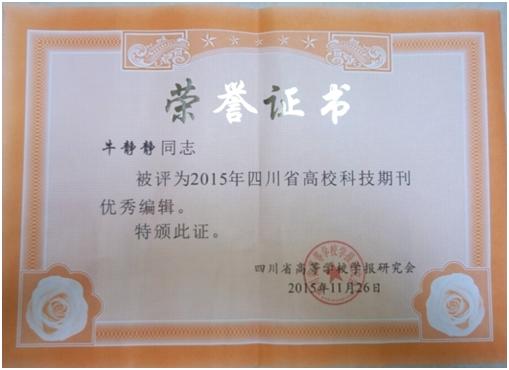 会议通报了2015年四川省高校自然科学学报研究会的工作报告,并报告了2015年财务收支情况。对2015年四川省高校科技期刊“优秀编辑部及优秀个人”进行了表彰,我中心牛静静被评为四川省高校科技期刊优秀编辑。