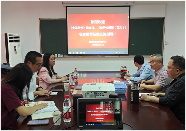 应学报中心邀请,2024年4月15日上午,《中国激光》杂志社总编辑王晓峰、新媒体部部长邓迎,《光子传感器(英文)》期刊负责人谢暄一行来中心交流访问。学报中心主任梁光川、《油气(英文)》编辑部张耀、《西南石油大学学报(自然科学版)》编辑部王旭东出席座谈会。座谈会由梁光川主持。