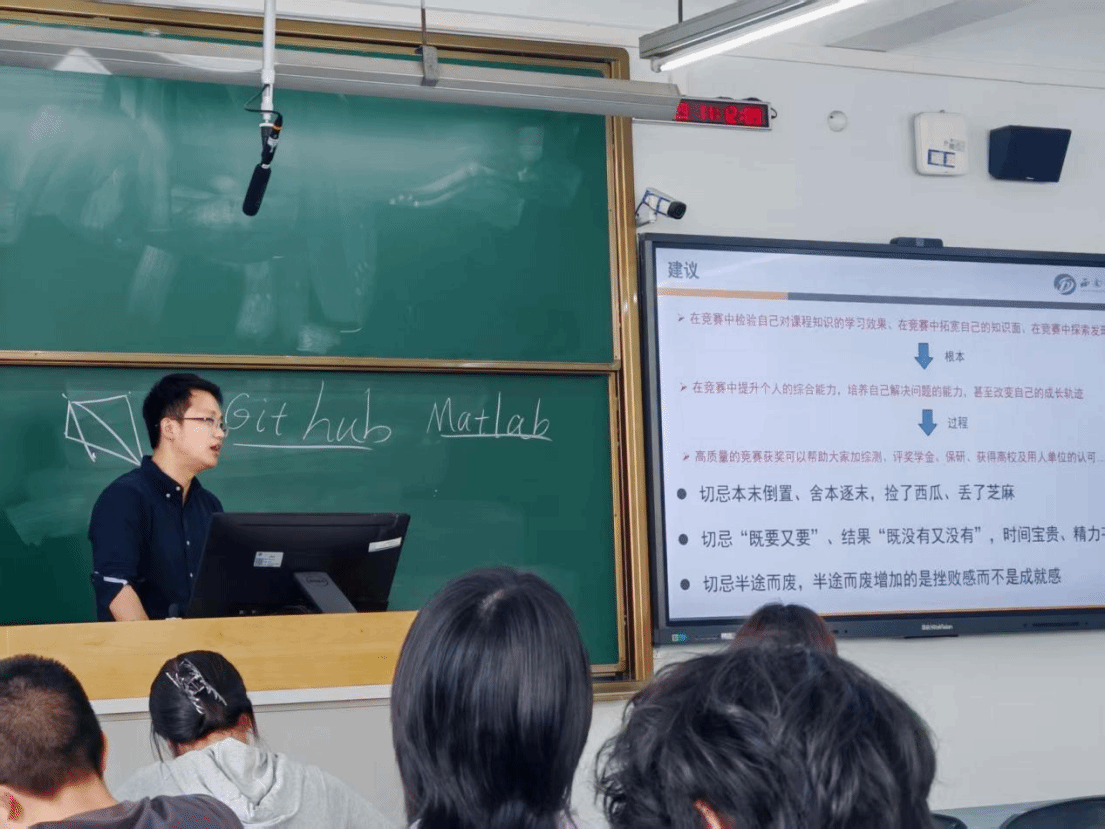 他结合自身参赛经验,带来了2018年参加数学建模大赛决赛作品的部分内容展示。通过这些真实的案例,同学们仿佛身临其境,感受到了数学建模大赛的魅力与挑战,也明白了如何运用数学知识和逻辑思维去解决实际问题,实现从理论到实践的跨越,这正是“从解题到破题”竞赛思维的生动体现。