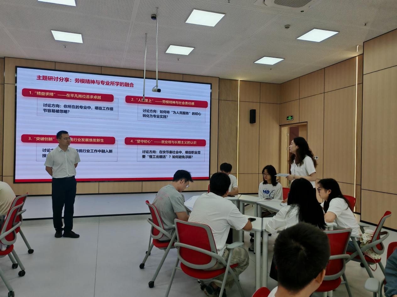 在小组研讨的环节中,来自不同学院不同专业的学生结合自身专业特色根据劳模精神主题进行研讨分享。经济与管理学院2023级研究生李鲁鹏说:“在快节奏社会发展过程中,要学习工匠精神,掌握好专业知识,锤炼过硬本领,树立正确的就业观念以真才实学应对当前就业的压力与挑战。”法学院2023级本科生王艺曦谈道:“不同的行业劳动方式不同,但无论是传统行业还是新兴产业,劳模精神、劳动精神、工匠精神体现在日常的努力和坚持中,今后将以劳模工匠为榜样,立足学生本位,苦练本领,努力提升自身专业水平。”