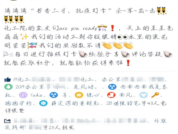 线上教学在有序进行,各类线上活动也在陆续启动。学生会开展的“书香三月,抗疫打卡”、“化重点:线上学习互助小组”,蔚然学生工作站的“同心抗‘疫’,学无止境”学习笔记线上打卡活动、“爱上石大的理由”有奖征集活动等等,让同学们在宅家战“疫”的同时,分享自己的学习和生活,营造良好的居家学习氛围,保证居家不停学,成长不掉线。