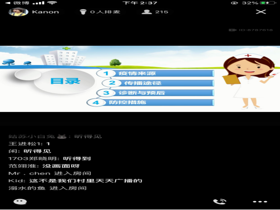 老师在直播中还提醒同学们,是否感染主要取决于与患者或无症状患者接触的机会,同学们要做到尽量不出门,出门正确佩戴口罩,勤洗手、勤消毒、勤通风、不聚会,早发现、早报告、早隔离、早治疗。同时倡导大家合理膳食,适量运动,做好自我心理调适,保持乐观积极的心理状态,科学防治,不信谣,不传谣。