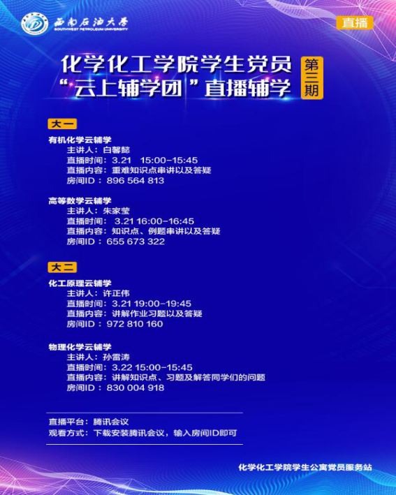 本次“云辅导”活动主要针对大一有机化学、高等数学科目的重难知识点、例题串讲以及答疑,对大二化工原理、物理化学科目的知识点与习题讲解、答疑。