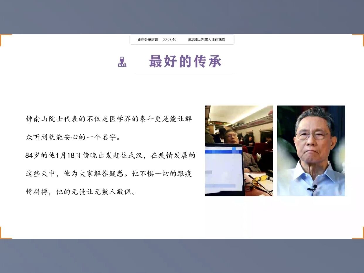 本次团组织生活以观看防疫主题新闻视频、访谈视频为主,兼有同学自由发言的方式展示疫情形势及前线医护人员的奉献事迹。在团组织说明活动相关事宜及奏团歌后,班长以文字、图片的方式,辅以语音的讲解,从感染人数、持续时间及对社会的影响,多方面介绍了此次疫情的整体情况,完善同学对疫情的了解。接着,通过放映新闻视频、钟南山专家的访谈视频及医护人员的采访视频,让同学们从新闻事实报道、专家建议及评论、医护人员的奋战事迹及感想,多元立体的了解了疫情期间不同人群的感受和体会,更直观的感受到疫情肆虐下千千万万毅然赶赴抗疫前线的英雄,用自己的血肉之躯筑起了一道守护人民健康的防护线,不计生死,不求回报。最后以PPT总结的方式,概括了本次团组织生活的主题及要点,确保人人参与且有收获的情况下,圆满结束了本次的团组织生活。