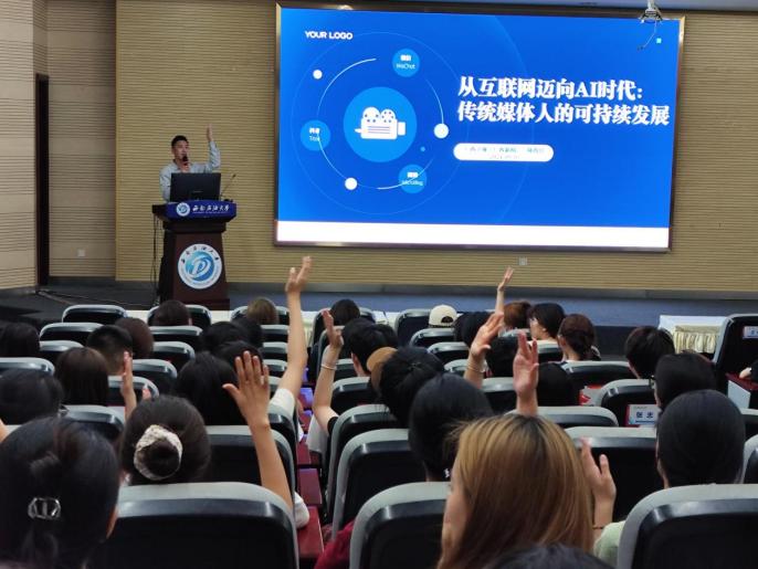 优秀校友、广西广播电视台新闻中心主持人陈俊佳开展以“从互联网迈向AI时代:传统媒体人如何实现可持续发展”为主题的讲座。他围绕AI时代下的传媒产业发展趋势、传统媒体人面临的挑战与机遇、如何利用AI技术提升个人和团队能力等方面进行了深入浅出的讲解,从不同角度剖析了传统媒体行业在互联网与AI时代的挑战与机遇以及未来如何实现可持续发展,为在场的师生提供了宝贵的建议和思路。