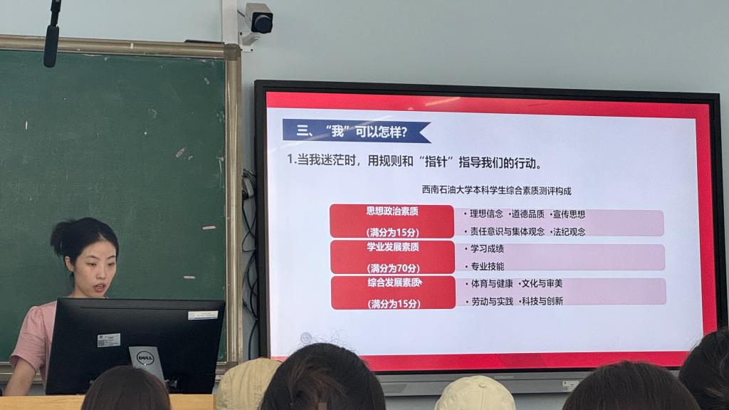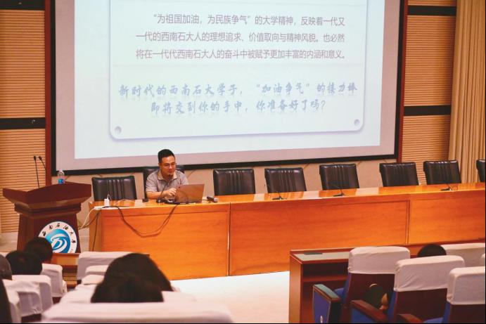 艺术学院团委副书记李安然以“解码西南石油大学的大学精神”为主题,为新生们揭开西南石油大学大学精神的神秘面纱。他追溯了西南石油大学大学精神的提法由来,深情地讲述着学校的历史渊源,让新生们感受到那份穿越时空的厚重与荣耀。他提到,大学精神是学校的灵魂,是历代石大人共同铸就的精神丰碑。随后,他通过一系列历史载体,从压在车顶的煤气包到鸡窝里飞出的金凤凰再到加油争气的传家宝,生动讲述了四川石油学院的成立过程,也展现了大学精神的传承与发展。他鼓励新生们要珍惜这些宝贵的精神财富,从中汲取力量,不断前行。