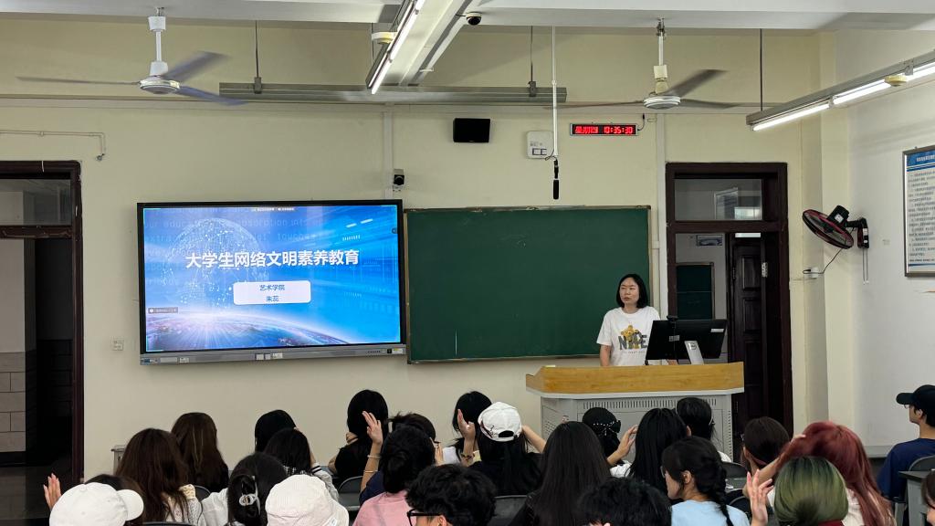 艺术学院2022级辅导员朱蕊开展“大学生网络文明素养教育”,从“维护网络文明,人人有责”“网络文明素养,人人知晓”“学生网络行为规范,人人遵守”三个层面阐述大学生网络文明素养的内容。她呼吁同学们要自觉遵守网络道德规范,理性表达观点,共同营造清朗网络空间,做具有网络文明素养的新时代大学生。