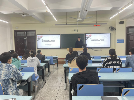 本期训练班共10个课时,1个课时为120分钟,其中理论教学4课时、集训实训4课时、测评反馈2课时,教学过程以普通话听、说能力强化训练为主,普通话语音基础理论知识、语言学相关知识的教学为辅,并配合开展口语发音练习、朗读、有稿演讲等生动活泼的教学形式进行。艺术学院赵邦宇和人事处王瑞担任本期带训导师。