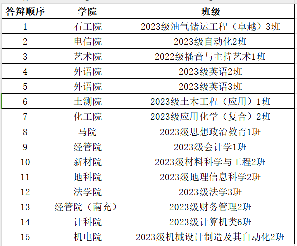 前期,学校易班组织各参赛班级抽签,已确定答辩顺序(详见下表)。各学院参赛班级依此顺序答辩,听从工作人员安排。