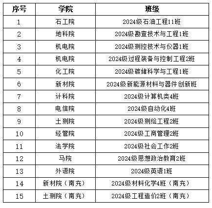 为进一步创新学生班级建设方式,推动学生日常教育管理服务与易班建设高度融合,加快构建我校以易班为主体的网络育人工作格局,切实提升我校网络育人工作实效,有效增强我校易班的示范性、引领性和辐射度,根据《西南石油大学易班“十大网络班级”评选办法(试行)》,本着公平、公正、公开的原则,经自愿申报、学院初选、材料评比、复赛答辩等程序,入围2024-2025学年(第九届)易班“十大网络班级”决赛的15个班级已产生。具体如下: