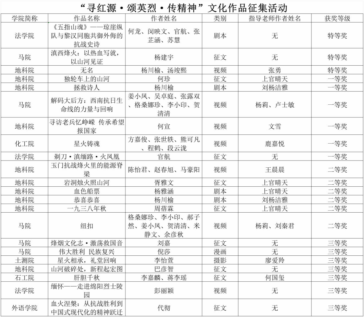 为深入贯彻落实党的二十大相关战略部署,深刻领会习近平总书记关于“铭记历史、缅怀先烈、珍爱和平、开创未来”的重要论述精神,充分挖掘中国抗日战争这一中华民族历史上规模最大、持续时间最长、牺牲最惨烈的民族解放战争所蕴含的精神价值,学校在暑假期间组织开展“寻红源·颂英烈·传精神”文化作品征集活动,经自愿申报、学院推荐、专家评审等环节,“寻红源·颂英烈·传精神”文化作品征集活动结果已产生。具体结果如下: