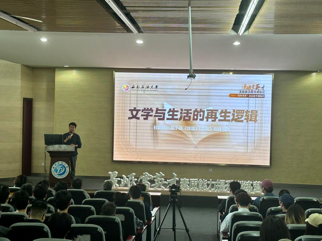杜阳林先生以“文学与生活的再生逻辑”为主题展开宣讲。作为中国作家协会会员、四川省作协主席团委员、巴金文学院签约作家,他结合自身从资深媒体人到文学创作者的跨界经历,深入剖析文学创作与生活体验的互动关系,阐释语言表达对个人思维塑造、情感传递及社会沟通的深远影响。他通过《惊蛰》《立秋》等代表作品的创作故事,鼓励学生“以文字为镜,观照内心;以表达为桥,连接世界”,现场互动频频,反响热烈。