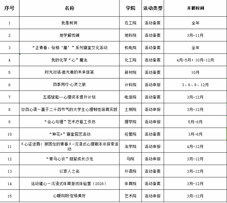 按照《西南石油大学心理健康教育特色精品活动管理办法》,经各单位自主申报、评委评审,2026年“一院一品”学院特色精品活动备案9项,