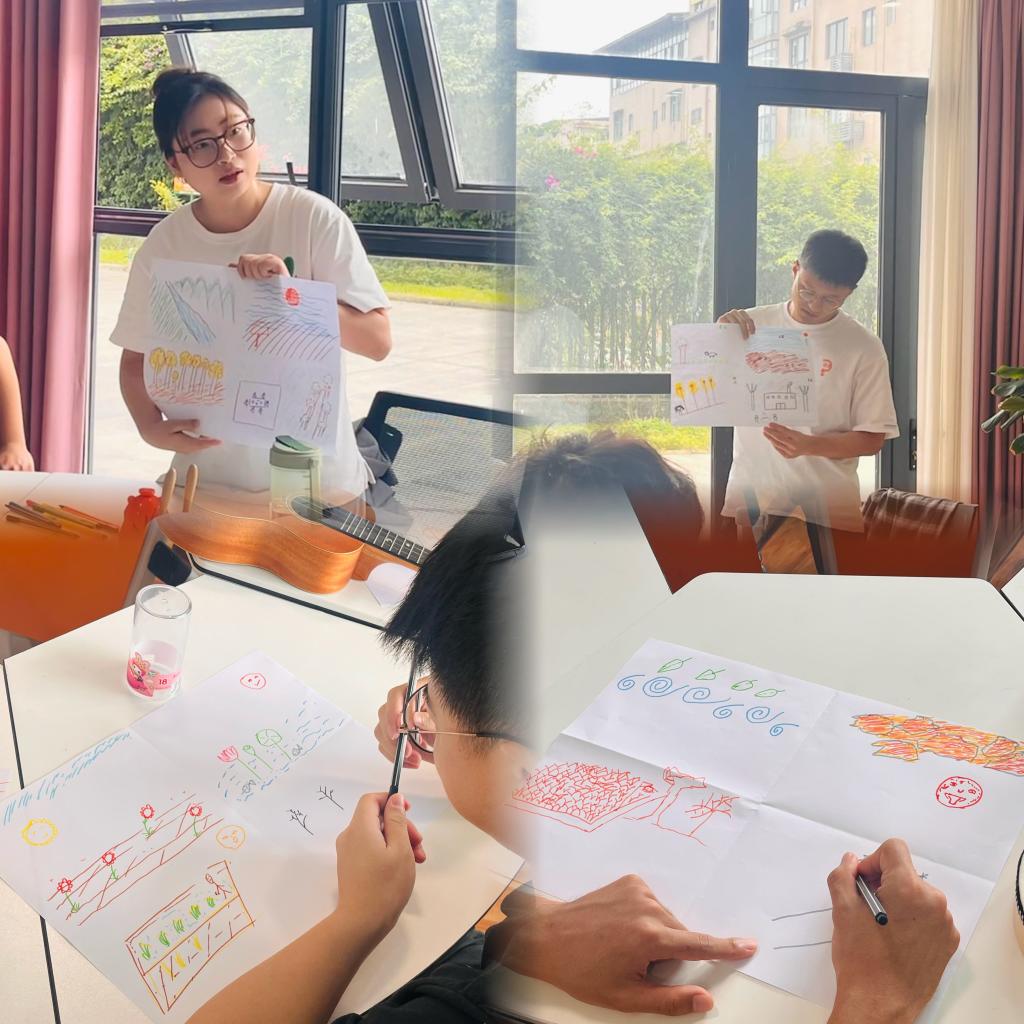 此次活动以“音乐”为主题。活动开场,张老师用音乐声势活动“布谷鸟”进行热身,促使大家相互认识、快速熟络起来;随后,鼓励大家感受当下的情绪并进行评分,通过欣赏四季的音乐,进行意象探索并绘到纸上,形成自己的四季故事,分享作品;接着张老师带领同学们进入“音乐与意象”的体验之旅,在舒适的氛围中进行放松体验,释放内心的压力。“音乐艺术创造的音乐意象,其核心内容是情感或情绪,体会音乐与心灵情感的融合,启动心能量,拥抱心生活。”张老师说。