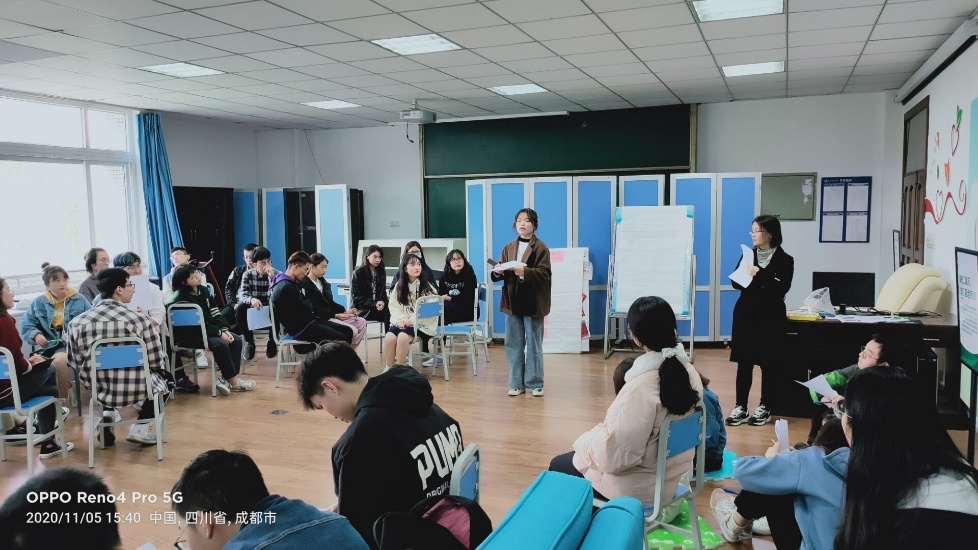 本期培训主要分为理论学习和讨论改进两个环节,活动伊始,刘成宁同学运用上期培训所学的心理团辅知识带领大家进行了热身和分组,在欢乐的游戏中带动了培训现场的氛围,让同学们以更加饱满的精神状态投身到之后的培训活动当中。