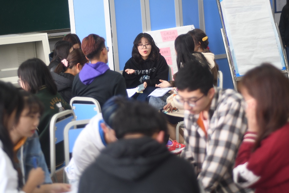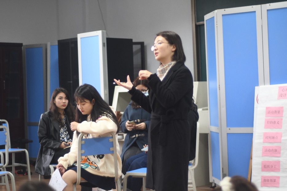 随后,翟玮炜老师就“心理活动的设计和开展”进行了全方面的理论指导。各组心理骨干根据自己以往举办活动的经验列举出举办心理活动所需要的关键性因素,结合各组的分享和老师的点评,将心理活动的设计和开展大致分出了以下几个步骤“活动背景、目的意义、时间地点、活动内容、组织分工、物资预算”。