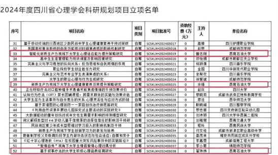 近日,四川省心理学会公布了“四川省心理学会心理健康教育研究与实践基地名单”和“2024年度四川省心理学会科研规划项目立项名单”。在200余家申报单位中,我校心理发展与服务中心脱颖而出,成功获批心理健康教育研究与实践基地。心理中心选拔推荐的土测院曾志刚、心理中心余强和翟玮炜三位教师的项目入选科研规划项目。