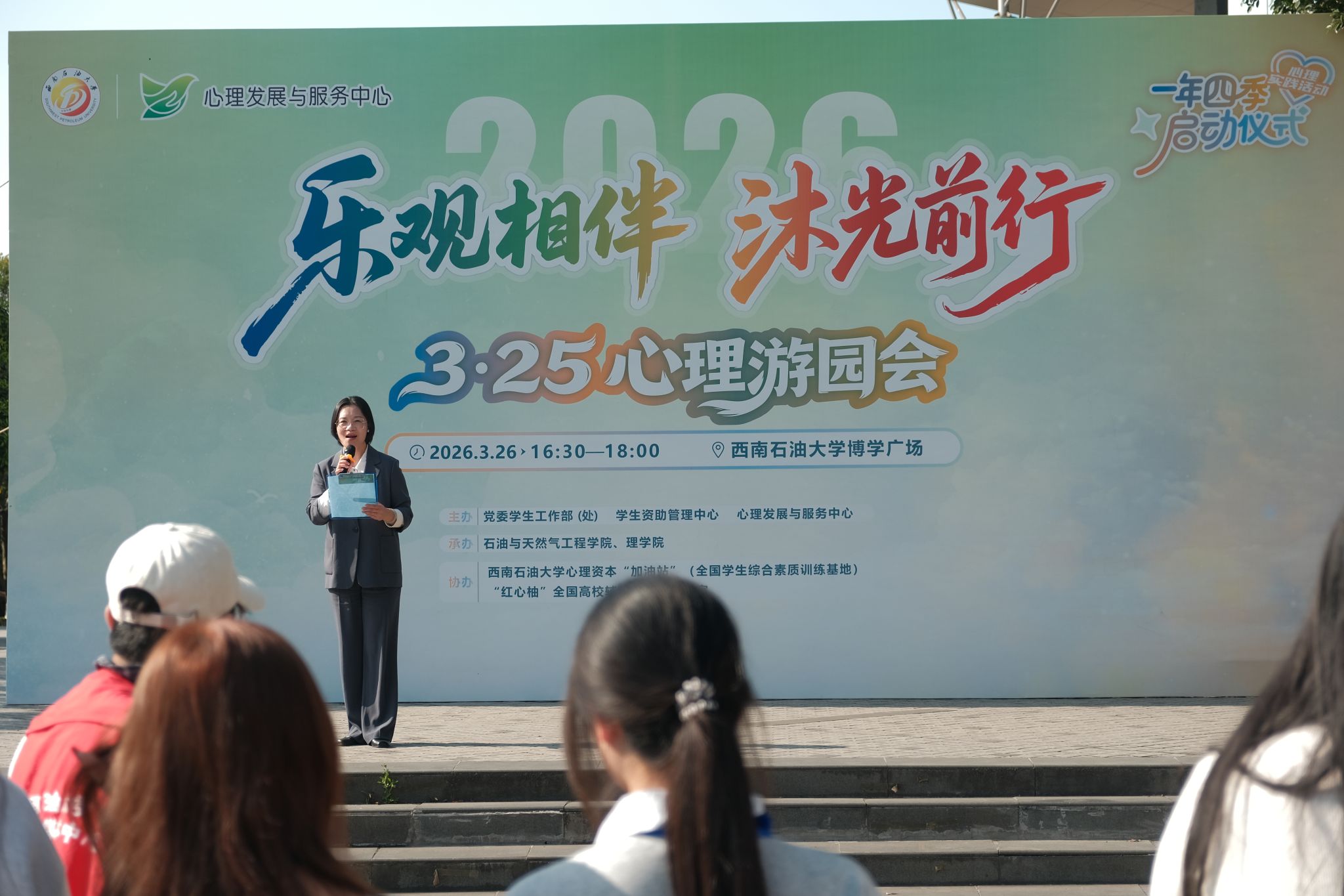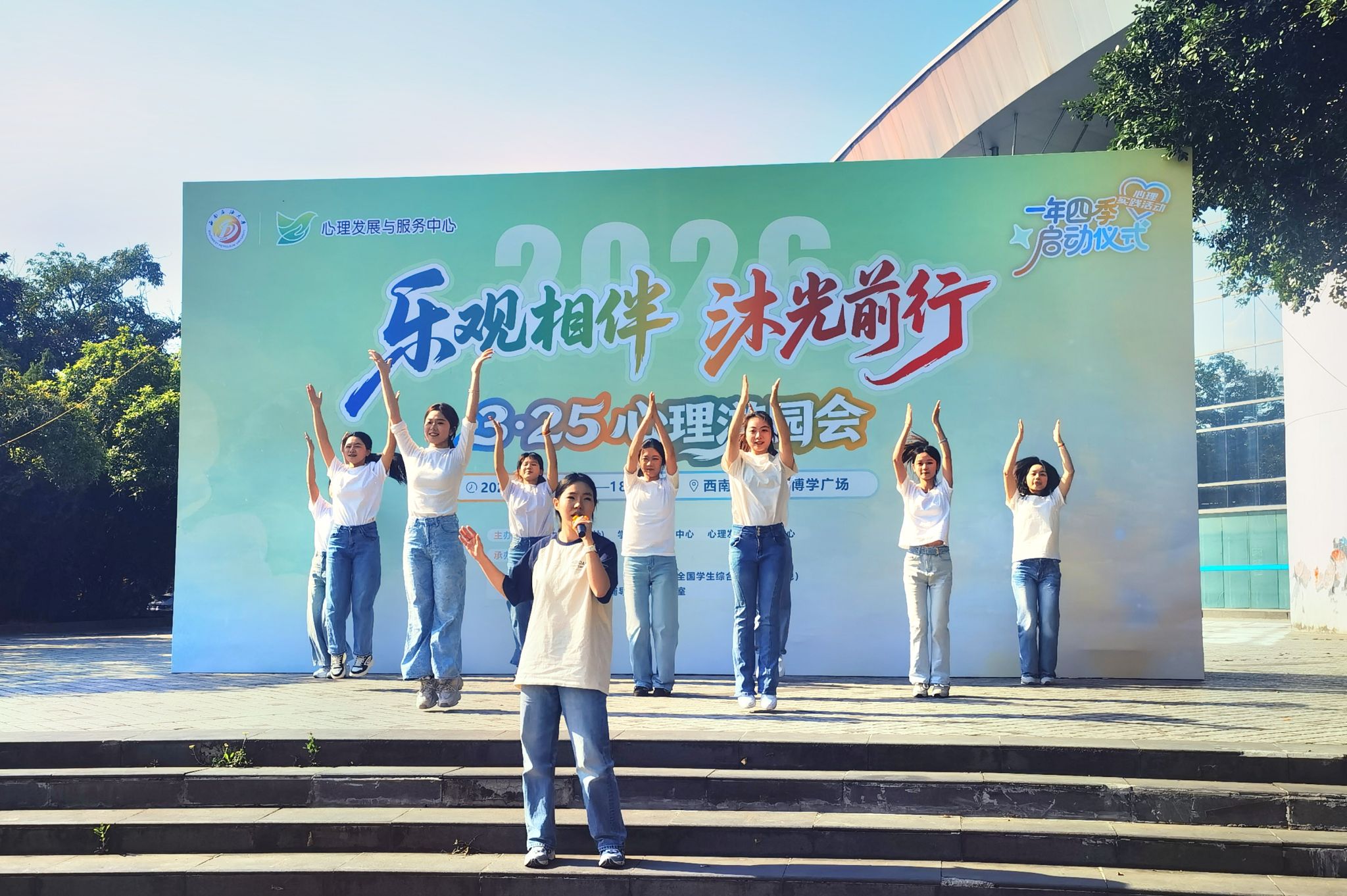 活动在活力满满的暖场歌舞《新的心跳》中拉开序幕。启动仪式上,心理发展与服务中心副主任舒小立发表致辞,系统介绍了学校“一年四季”心理实践活动的整体规划,春季以游园会开启“3·25善爱我”序幕,夏季聚焦“5·25我爱我”,通过心理情景剧等深化自我关怀,秋季结合新生入学,以“9·25就爱我”启动新生心理节,冬季在“12·25珍爱我”活动季,举办心理微视频比赛和朋辈技能提升训练营。此外,中心结合同学们成长需求,还有艺术疗愈为主的心理沙龙,主题深化的阳光心成长讲座,以及“一院一品”的学院特色精品活动共30项活动贯穿全年。