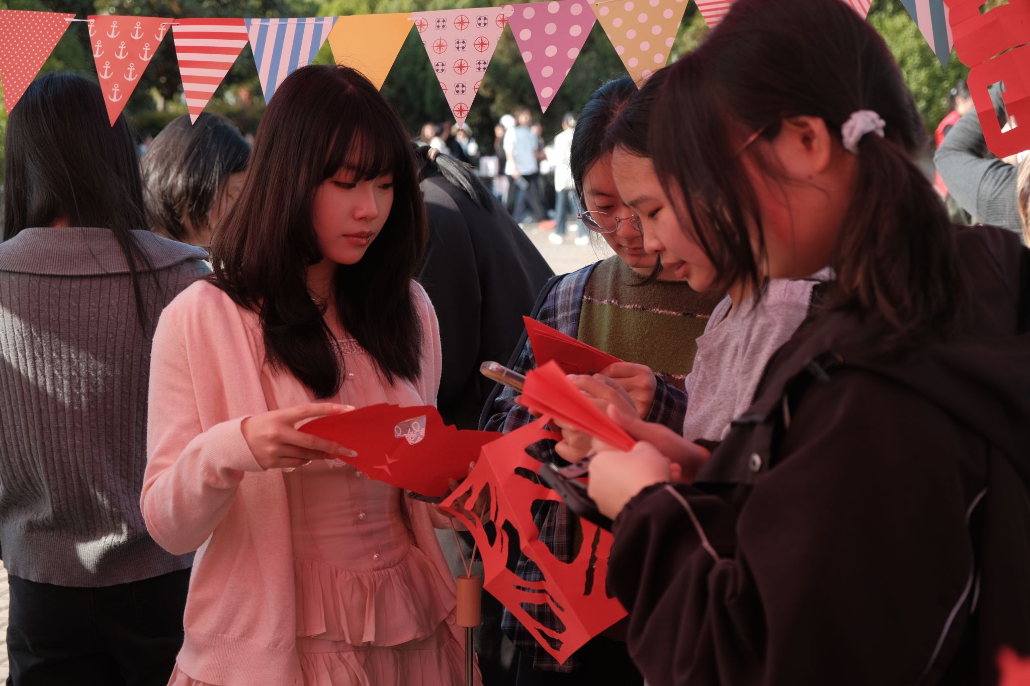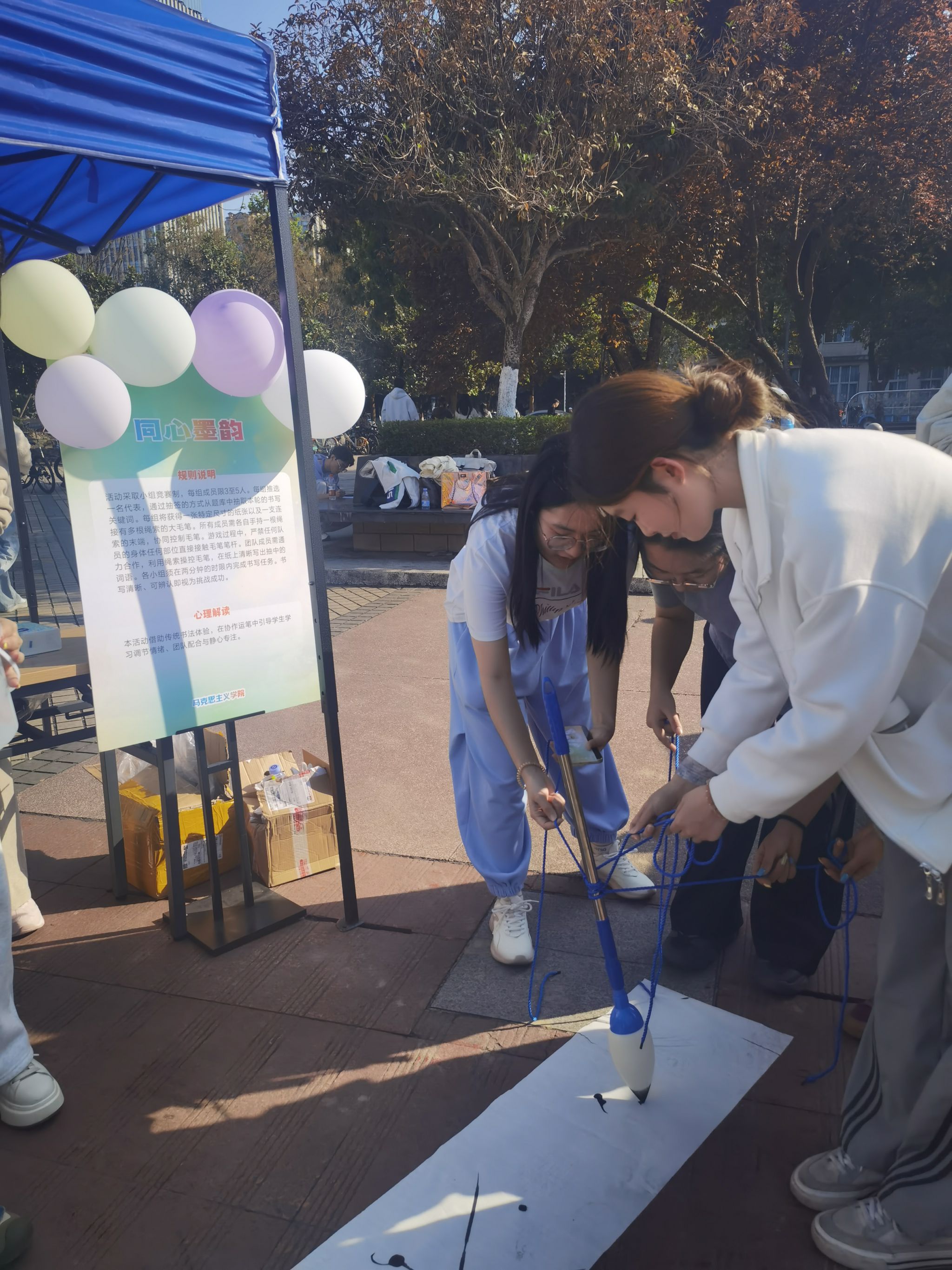 本次游园会精心打造了13个特色鲜明的心理体验展台,将心理知识科普、团队协作赋能、传统文化浸润与艺术疗愈功能深度融合。地科院的“同舟共济”让同学们在合作中,强化人际信任与默契配合;新材院的“香伴前行”以传统香囊制作为载体,带来沉浸式疗愈温暖体验;土测院的“扇舞风化”通过融合传统射艺与非遗美学,让学生在动静平衡中涵养性情;艺术学院的“书心布语”则用植物拓印引导情绪表达。丰富多元的活动让同学们在轻松欢乐的氛围中释放压力、探索自我,现场参与热情高涨,欢声笑语不断。