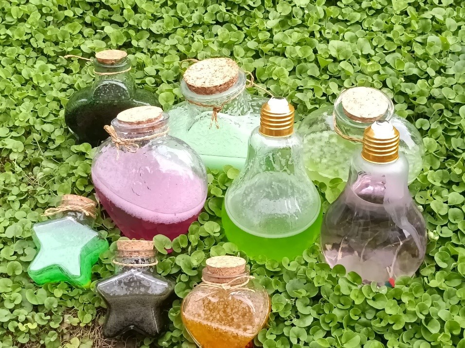刺鼻的樟脑味逐渐消散,溶液随之变得清澈透亮,最终,混合溶液被注入造型各异的玻璃瓶,加入靛蓝颜料与海绵宝宝装饰物的瞬间,实验室仿佛变成童话工坊。