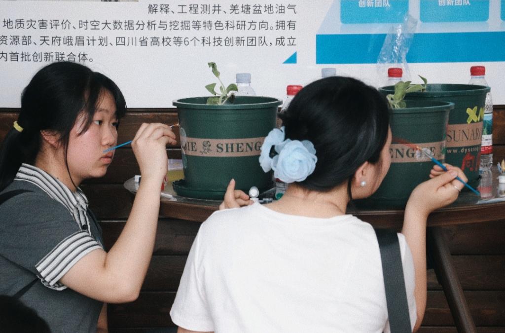 活动伊始,同学们充分发挥想象力与创造力,利用活动现场精心准备的颜料与绘笔,对自己的花盆进行DIY创作。在描绘花盆的过程中,大家一边勾勒图案,一边与同伴分享自己对向日葵生长的期待,现场氛围轻松愉悦,欢声笑语不断。原本朴素的花盆,在同学们的巧手下变得色彩斑斓、充满个性,承载着大家对美好未来的憧憬。勘查技术与工程专业2023级的姚成程同学难掩激动,她表示:“这次向日葵栽培活动让我触动万分,向日葵一直是在我心里一直是希望的象征。这次活动让我体验到了亲手种下希望的美好,我相信在盛夏时节我的希望之花会开的绚烂,开得热烈。”