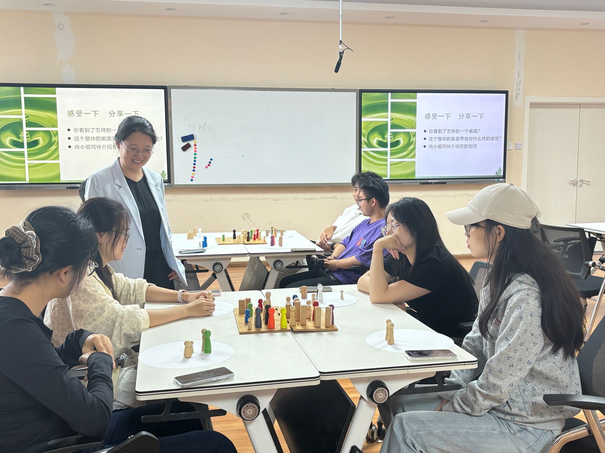 活动中,同学们在安静的氛围中,借助各式小木人,自由摆出心中“家”的模样。整个过程无需言语,只需跟随内心的第一感觉,让情感在方寸之间自然流淌。随后,同学们在小组中分享了自己创作的画面与感受,倾听彼此的故事,在真诚与尊重的氛围中感受“家”的模样;