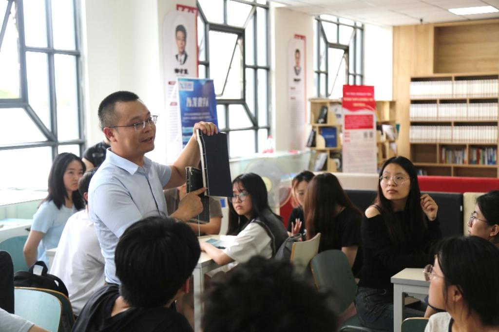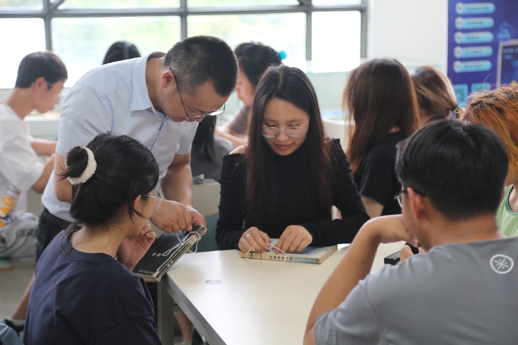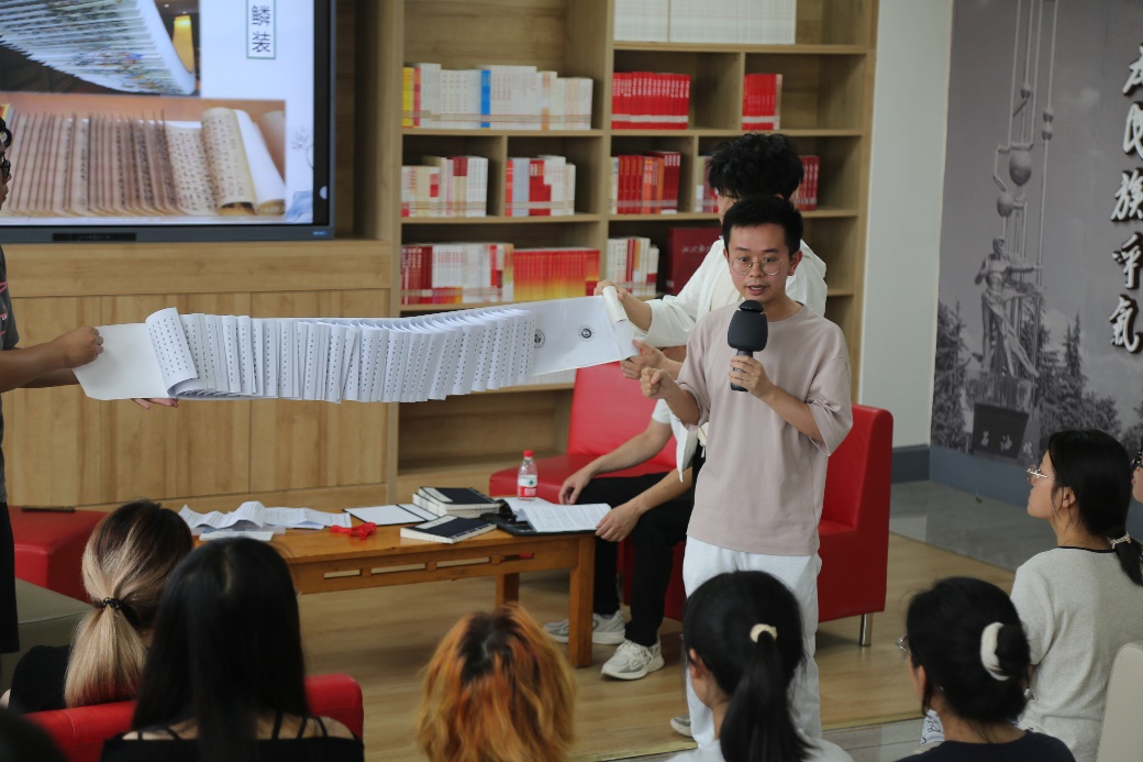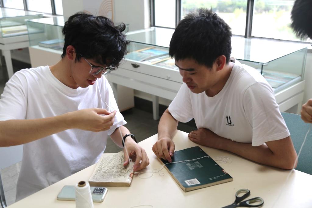 新能源与材料学院2023级罗宗权同学,拿着一册线装版《文心雕龙》发出感叹:“太美了!我最喜欢卷轴装之后的龙鳞装,其装订方式和外观真的令我非常震撼!”图书馆馆史文化厅内,40名来自各个学院的同学认真地穿针引线,用古籍装帧的简式四眼装订法完成了他们的劳动成果,每人修复完成了一本破损图书。