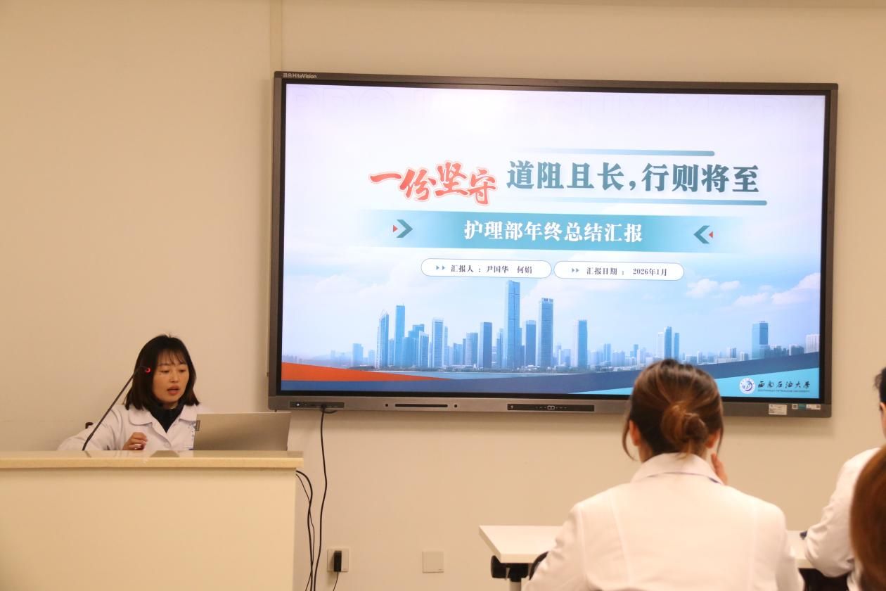 会议围绕“启:初心回顾”“践:履职纪实”“精:专业提升”“谋:来年计划”四大板块回顾了护理团队以专业筑牢护理防线,用温度传递医疗关怀的使命初心;列出了过去一年在临床护理、院感防控、健康教育与师生健康管理等方面的履职实绩;重点总结了在深化优质护理服务内涵、加强护理质量与安全管理、推进护理队伍专业化建设等方面取得的提升与突破;并对2026年度的重点工作方向进行了规划与部署。