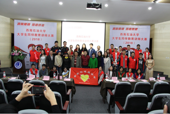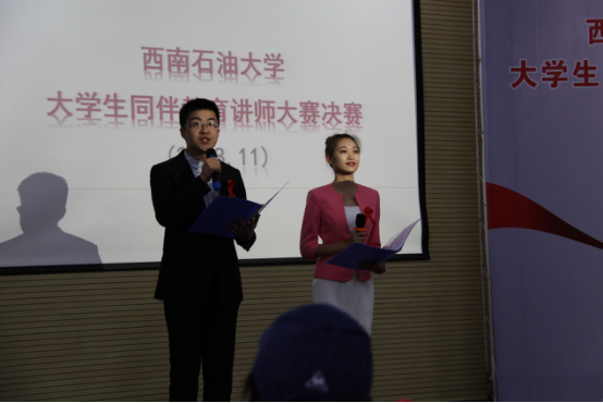 为积极组织我校大学生参加成都市第一届高校学生同伴教育讲师大赛,为我校学生参与校园防艾活动提供新平台和新机会,进一步推动我校防艾活动和大学生同伴教育工作广泛深入开展。经过线上线下广泛动员与宣传,11月4日下午3点,由西南石油大学防艾办公室、共青团西南石油大学委员会共同主办,安全与健康协会承办的以“消除障碍,搭建桥梁”为主题的大学生同伴教育讲师大赛决赛在明志楼B105顺利举行,大赛特邀四川省教育厅学校防艾工作专家组副组长卢旭,成都市疾控中心艾防科代珍,新都区疾控中心副主任黄智芬,新都区卫计局梁海东,新都区疾控中心李会,西南石油大学校医院院长张继红,校团委副书记张维,校团委实践中心主任蒲彦羽出席并担任大赛评委,成都医学院、四川文化产业职业学院、及西南石油大学200余名学生观看了比赛。