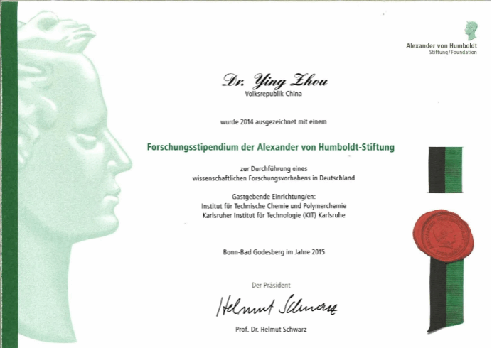 图1.德国洪堡学者周莹教授证书
