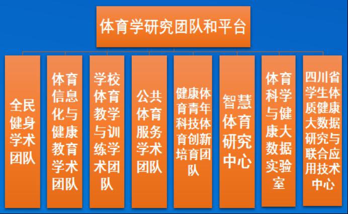 拥有全民健身、体育信息化与健康教育、学校体育教学与训练、公共体育服务等5个科研团队,以及智慧体育与健康研究中心、体育科学与健康大数据实验室、四川省学生体质健康大数据研究与联合应用技术中心三大科研平台,定期开展学术沙龙活动。
