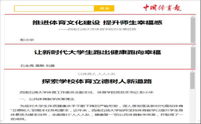 1、学校非常重视体育教育工作。开展了课外健身跑、体育俱乐部教学、竞赛联盟、减脂塑形课程等多项教学改革。获批国家级一流线上课程1门、教育部社区教育特色课程1门。疫情期间在线推出20期《居家防疫健身指南》,得到“学习强国”转载。2021年获得两项四川省高等教育教学成果奖二等奖。教学改革得到《中国教育报》《中国体育报》等国家级媒体多次报道。