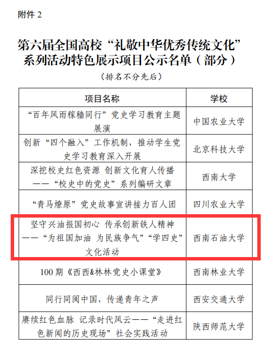 近日,教育部思想政治工作司公示了第六届全国高校“礼敬中华优秀传统文化”系列活动遴选结果。由我校党委宣传部申报的《坚守兴油报国初心传承创新铁人精神——西南石油大学“为祖国加油为民族争气”“学四史”文化活动》获评特色展示项目。