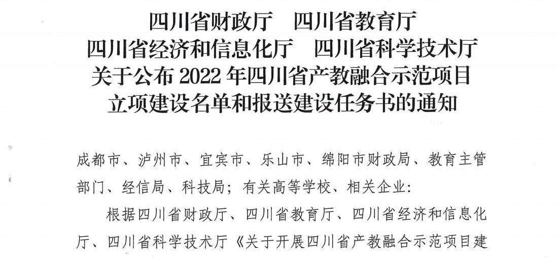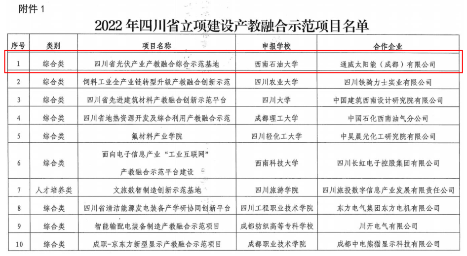 近日,四川省财政厅、四川省教育厅、四川省经济和信息化厅、四川省科学技术厅发文公布了2022年四川省产教融合示范项目立项建设名单,我校与通威太阳能(成都)有限公司联合申报的“四川省光伏产业产教融合综合示范基地”获批,省财政将给予项目5000万元资助。