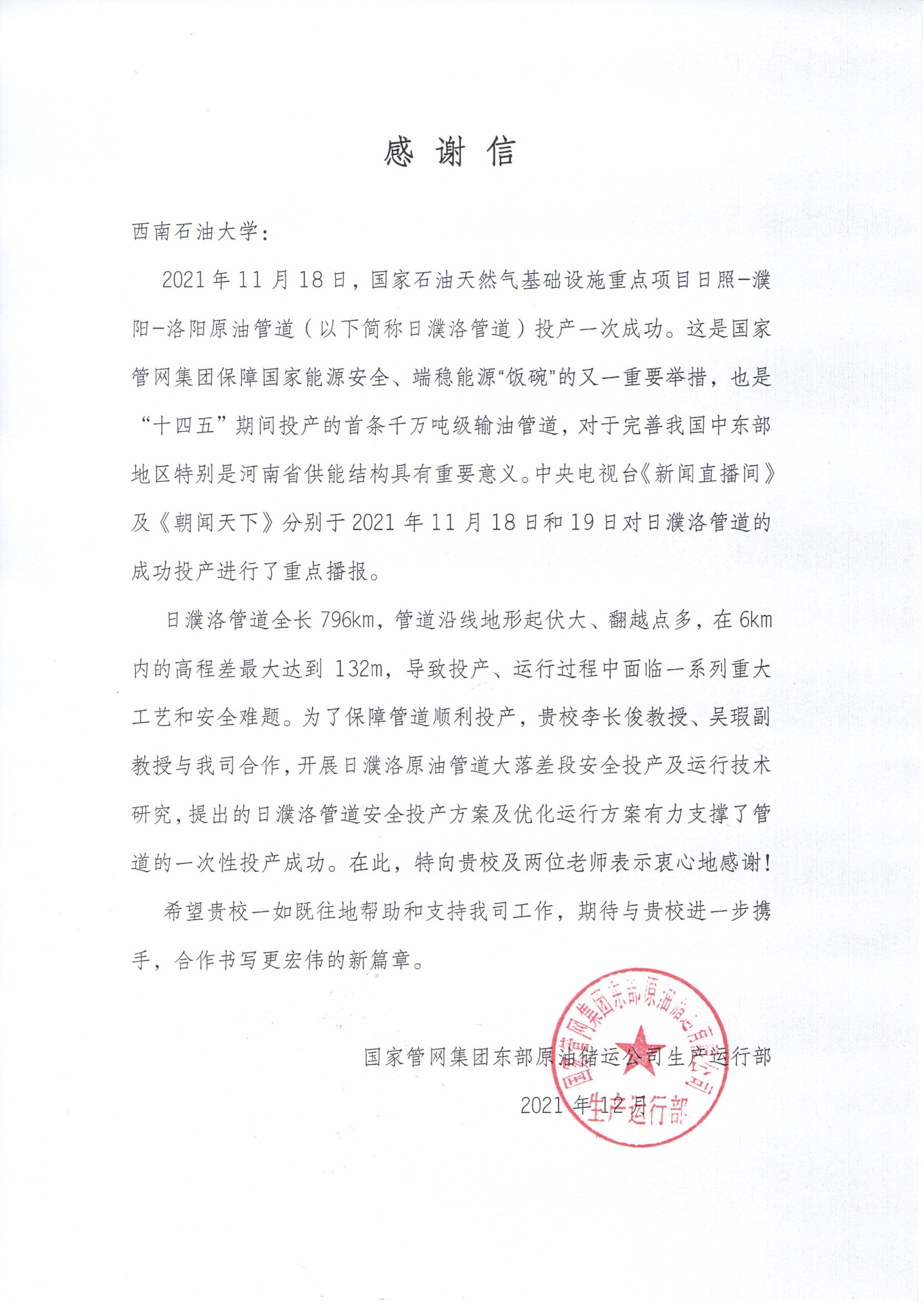 11月4日,国家管网集团东部原油储运公司给我校发来感谢信,对李长俊教授团队为我国“十四五”首条千万吨级输油管道——日照-濮阳-洛阳原油管道(以下简称日濮洛管道)的成功投产做出重要贡献表示感谢。
