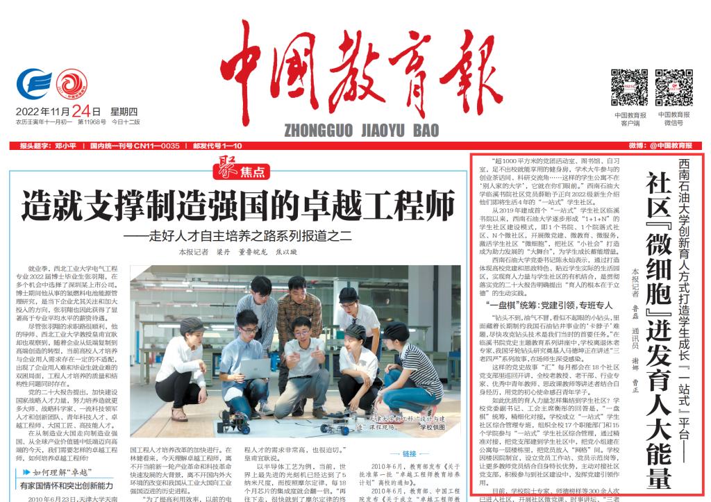 2020年9月,学校在学生公寓22栋开展试点,建成我校首个“一站式”学生社区——临溪书院。2021年12月,以临溪书院为基础,申报并成功入选教育部“一站式”学生社区首批自主试点单位。自“一站式”学生社区建设工作开展以来,学校按照“1+1+N”的建设思路,全力推进“一站式”学生社区建设不断走深、走实。近年来,我校聚焦“全校一心”“上下齐心”“师生同心”,坚持用“三心”撬动学生社区建设快速见效,全力打通“三全育人”最后一公里、学生步入社会“最先一公里”,助力学生德智体美劳全面发展。专项工作特色鲜明,成效显著,被《中国教育报》头版和光明网大篇幅报道。