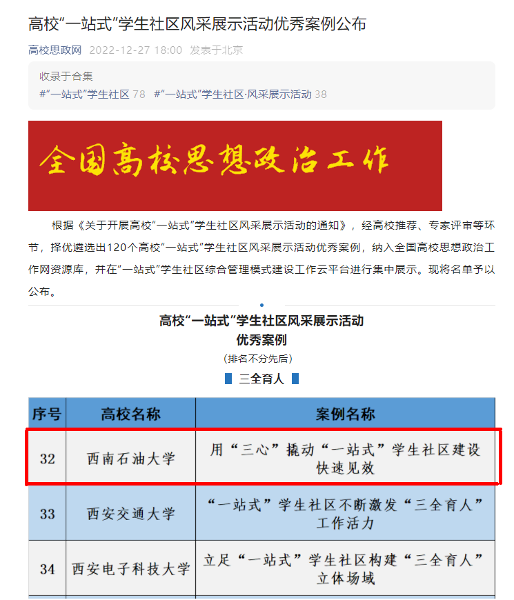 近日,教育部思想政治工作司公布了高校“一站式”学生社区风采展示活动优秀案例遴选结果,由我校党委学生工作部(处)牵头申报的“三全育人”单元展示案例《用“三心”撬动“一站式”学生社区建设快速见效》成功入选,并纳入全国高校思想政治工作网资源库,将在“一站式”学生社区综合管理模式建设工作云平台集中展示。