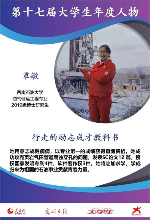 近日,第十七届“大学生年度人物”推选展示活动评选结果揭晓,我校石油与天然气工程学院油气储运工程专业2019级博士研究生覃敏在内,全国共20名大学生入选第十七届“大学生年度人物”。四川省仅2人入选,覃敏是全省省属高校中唯一入选学生。