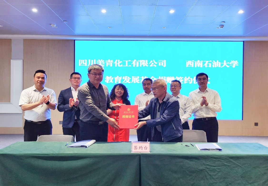 化工院党委书记王兵代表学院与美青化工签订捐赠协议并颁发证书。王兵详细介绍了学院学科发展、师资情况及调研目的,射洪市经科局工作人员介绍了射洪市经济发展和能源化工产业情况。会上,政校企三方在人才培养、科研合作、就业岗位拓展、政策待遇保障等方面进行深入交流。