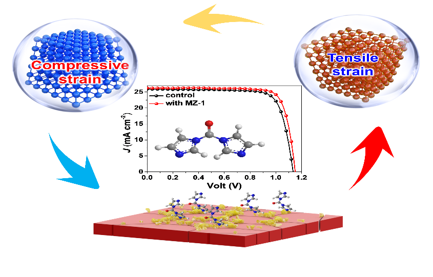 该研究提出了一种晶格匹配螯合策略来解决钙钛矿薄膜固有的不稳定性问题。研究表明,设计的二齿咪唑有机盐(MZ-1)可以牢固地锚定钙钛矿晶格,产生压应变钙钛矿薄膜,从而实现更好的能级排列、改善载流子传输、减少非辐射复合和降低陷阱态密度。基于MZ-1的钙钛矿太阳电池表现出24.61%的光电转换效率以及改进的长期光、热稳定性。与此同时,大面积(25 cm2)钙钛矿模组实现了20.53%的效率,为钙钛矿光伏产业化提供了重要技术思路。