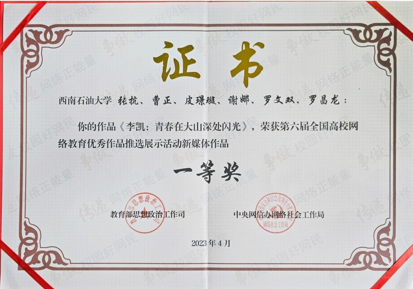 近期,教育部和中央网信办公布了第六届全国大学生网络文化节和全国高校网络教育优秀作品推选展示活动获奖作品名单。我校获评优秀组织奖(全省仅3个单位获评)。我校党委宣传部张抗、曹正等创作的《李凯:青春在大山深处闪光》获评新媒体作品类一等奖。这是我校首次获得全国高校网络教育优秀作品推选展示活动一等奖、优秀组织奖。此外,我校还获得三等奖2项,优秀奖4项,优秀制作水平奖1项。