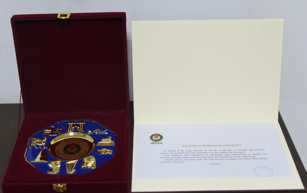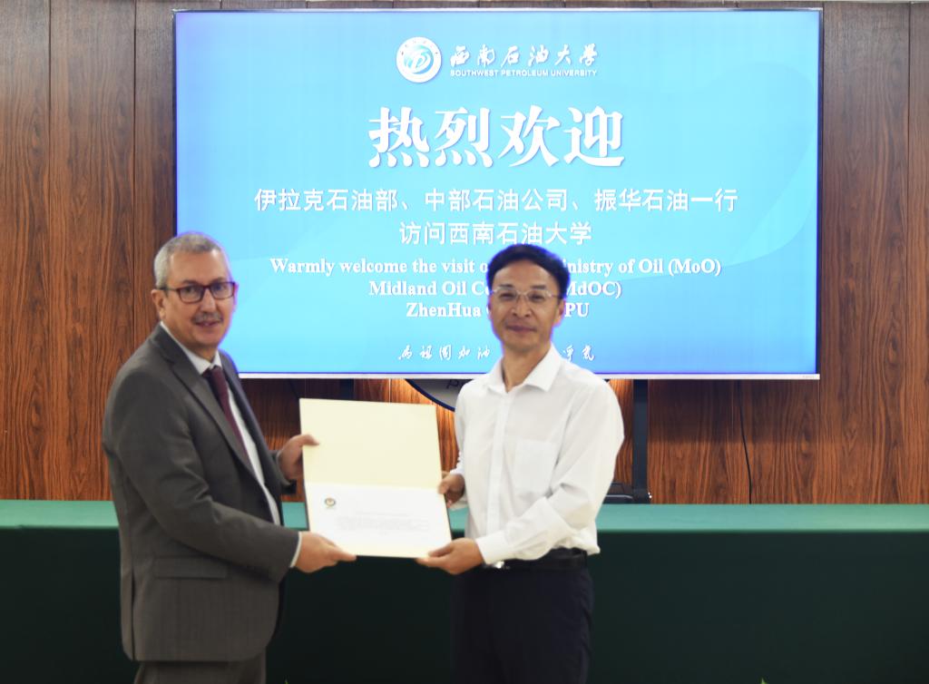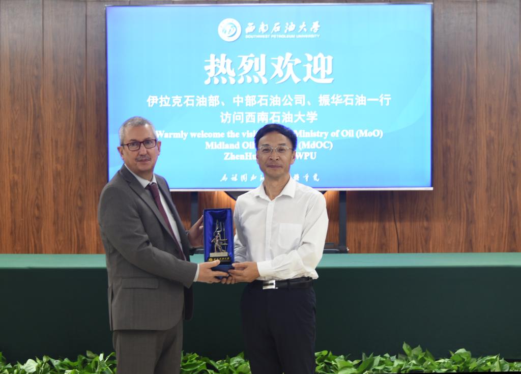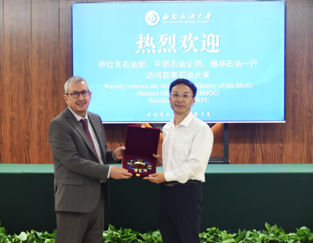 马津·阿巴斯·卡里姆对学校给予伊拉克留学生的关心和支持表示感谢;对学校在“振华石油奖学金项目”上付出的努力表示感谢;对学校助力伊拉克石油人才培养和未来产能建设战略表示感谢。他递交了伊拉克石油部给学校的感谢信,并和张烈辉代表双方互赠了礼物。在感谢信中,伊拉克石油部表达了对学校的敬佩和谢意。感谢学校给予伊方应用型、复合型、国际化高素质人才培养等方面的支持和贡献,期待双方充分发挥各自优势与特色,取得更多进步和成果。