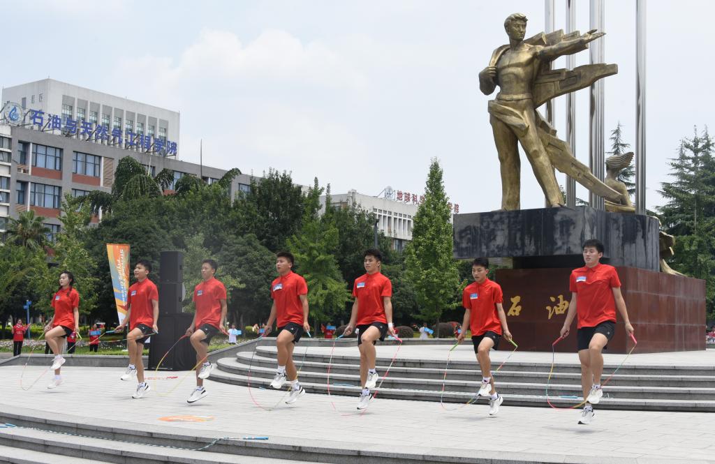 大运会火炬在我校传递期间,同学们在博学楼广场的火炬传递加油站和石油魂雕塑下分别表演了歌舞串烧和花样跳绳,向世界展示石大学子的激情与活力。